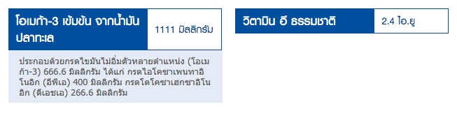 ผลิตภัณฑ์เสริมอาหาร น้ำมันปลาผสมวิตามิน อี แต่งกลิ่นวนิลาไร้กลิ่นคาว ให้กรดไขมันกลุ่มโอเมก้า-3 ได้แก่ อีพีเอ และดีเอชเอ มีโอเมก้า-3 เข้มข้น ให้ DHA 500 มิลลิกรัม (สูงเป็น 4 เท่าของสูตรน้ำมันปลามาตรฐาน) วิตามินอี มีส่วนช่วยในกระบวนการต่อต้านอนุมูลอิสระ ทำให้เลือดไหลเวียนดีลดไตรกลีเซอร์ไรด์ในเลือด ผ่านการตรวจสอบปริมาณสารปรอทและตะกั่ว